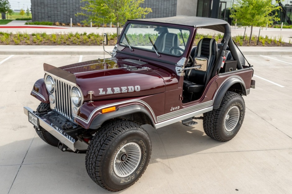 The body has been refinished in dark red metallic with gray accents and Laredo lettering on the hood. Features include a black surrey top, removable vinyl-covered doors, chrome bumpers with tow hooks, wide-set side mirrors, and a folding windscreen.