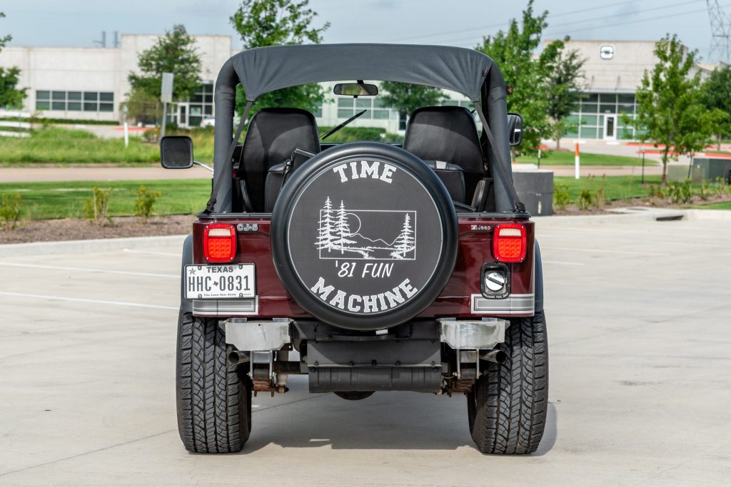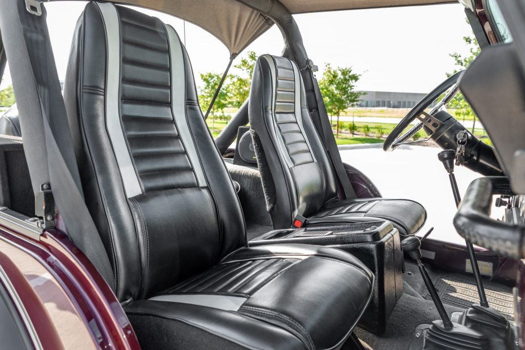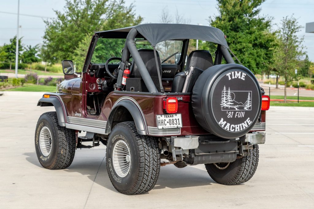 This 1981 Jeep CJ-5 was reportedly acquired by the seller from the original owner in 2009, and a subsequent refurbishment involved a repaint in dark red metallic, a reupholstered black interior, and the installation of a replacement 304ci V8 which is mated to a three-speed manual transmission and a dual-range transfer case. Equipment includes a Surrey top, removable doors, an aftermarket stereo, a lift kit, and 15″ alloy wheels with 33″ tires.