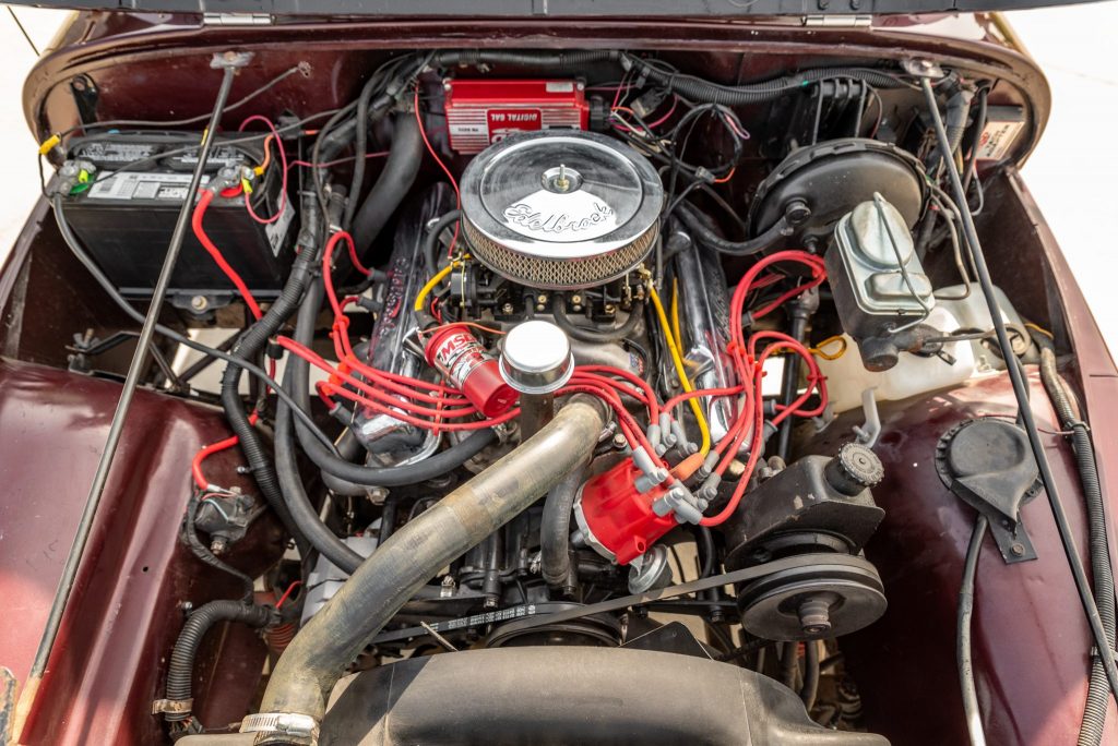 The replacement 304ci V8 was reportedly overhauled by Kim Barr Racing Engines of Garland, Texas, and it was installed by the seller in 2012. Modifications include an Edelbrock carburetor, an RV camshaft, and MSD ignition with an HEI distributor. The fuel system, tank, and lines were replaced and are connected to an electric fuel pump. The previously installed 4.2L straight-six engine is included in the sale.