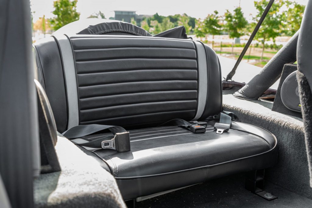The cabin features front bucket seats and a rear bench that have been reupholstered in black vinyl with gray accents. Equipment includes an aftermarket Axxera CD stereo, a heater, and Jeep-branded rubber floor mats.