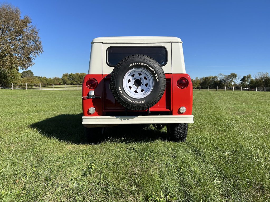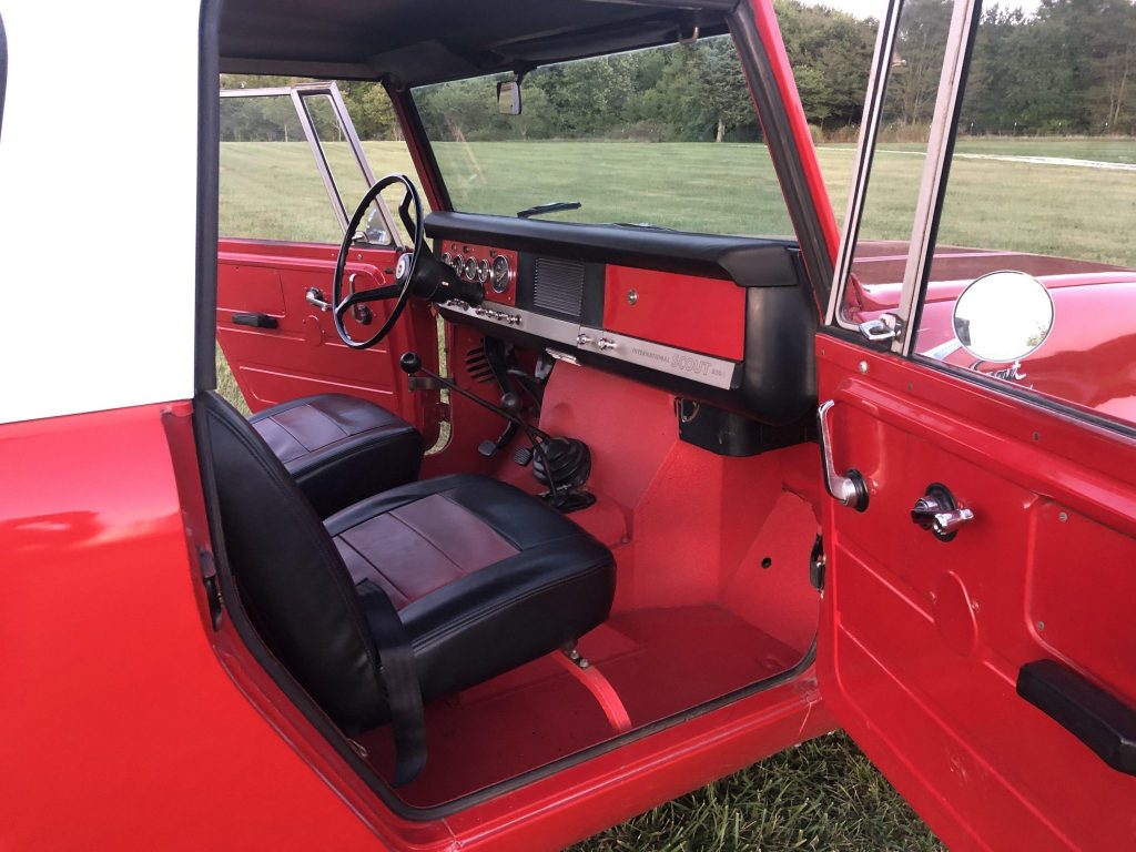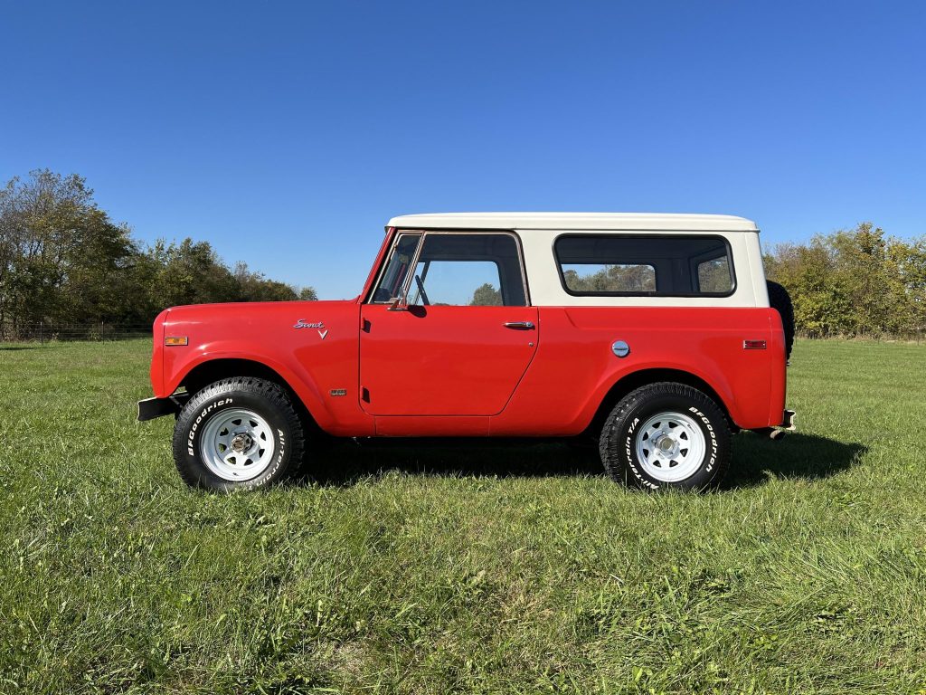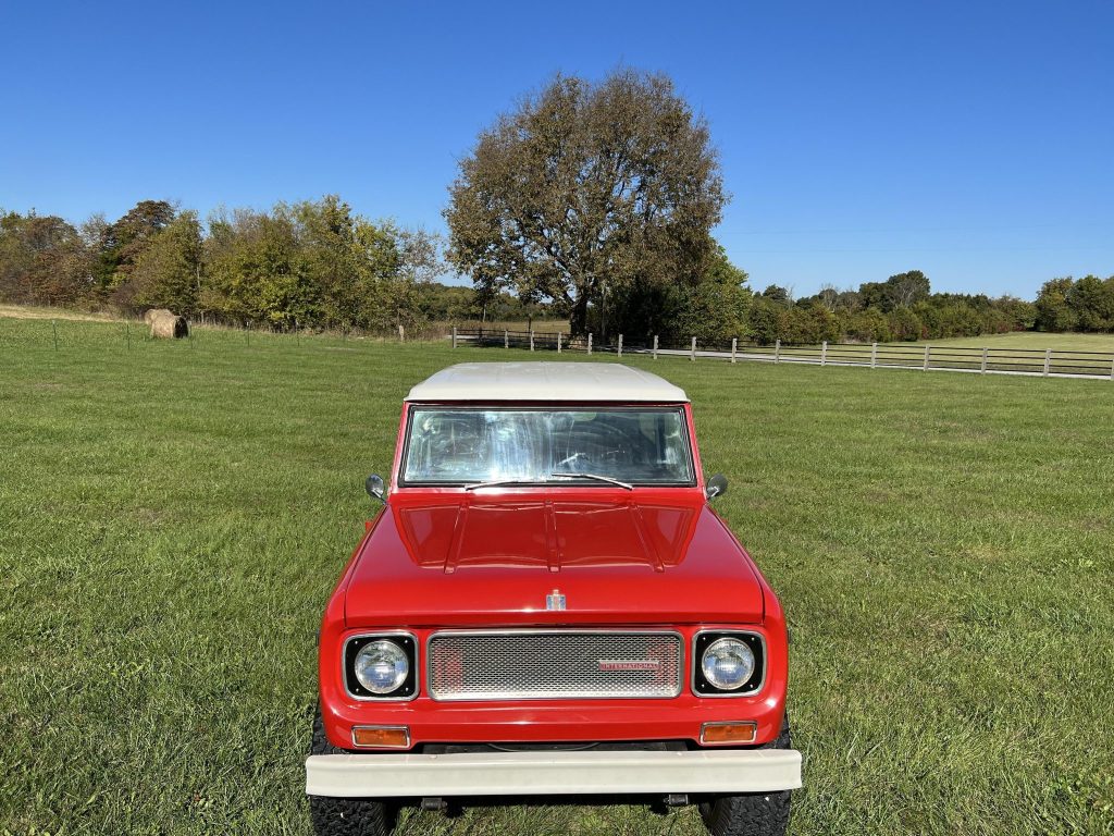 This 1970 International Harvester Scout 800A is a Traveltop 4×4 model that is finished in red with a white roof, and power comes from a 304ci V8 paired with a three-speed manual transmission and a dual-range transfer case. Equipment includes front bucket seats, front and rear lap belts, and aftermarket 15″ wheels with 31″ tires.