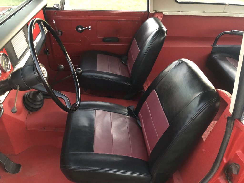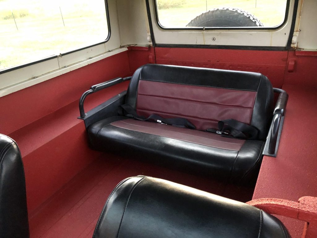The cabin features front bucket seats and a rear bench trimmed in black upholstery with burgundy inserts. The floors have been sprayed with red bedliner material, and additional equipment includes a heater and front and rear lap belts.