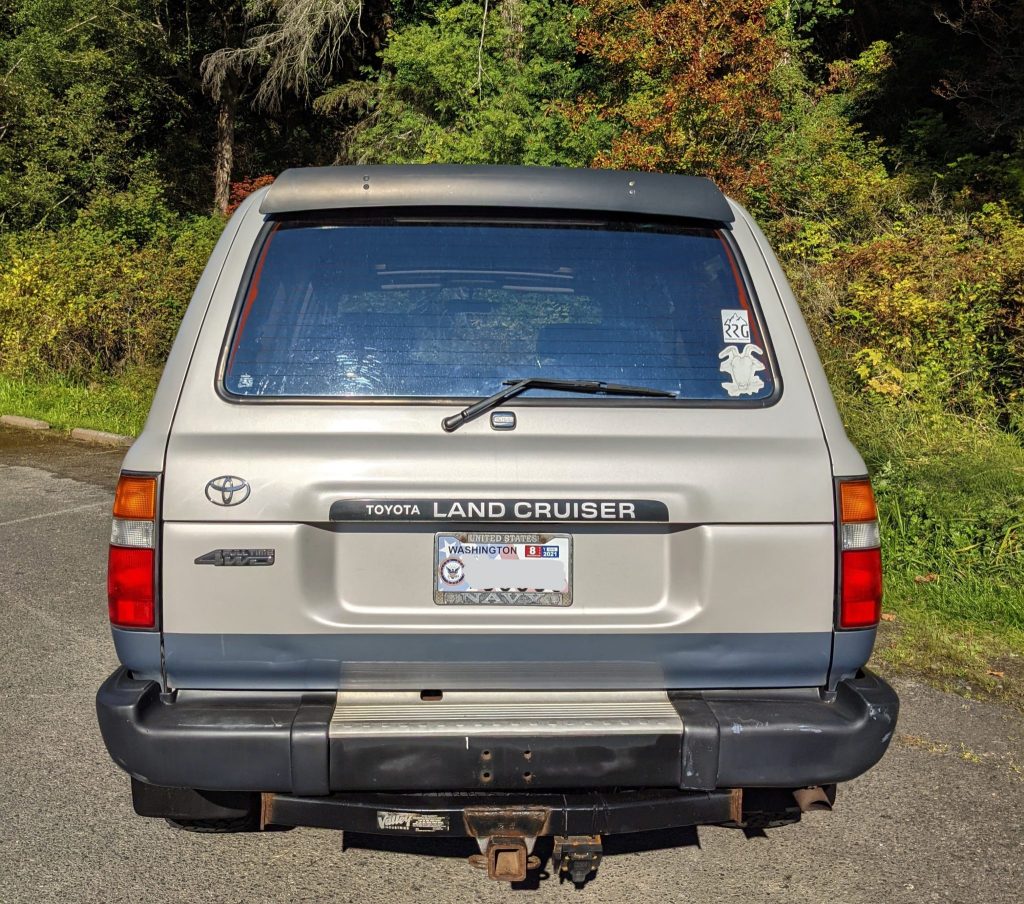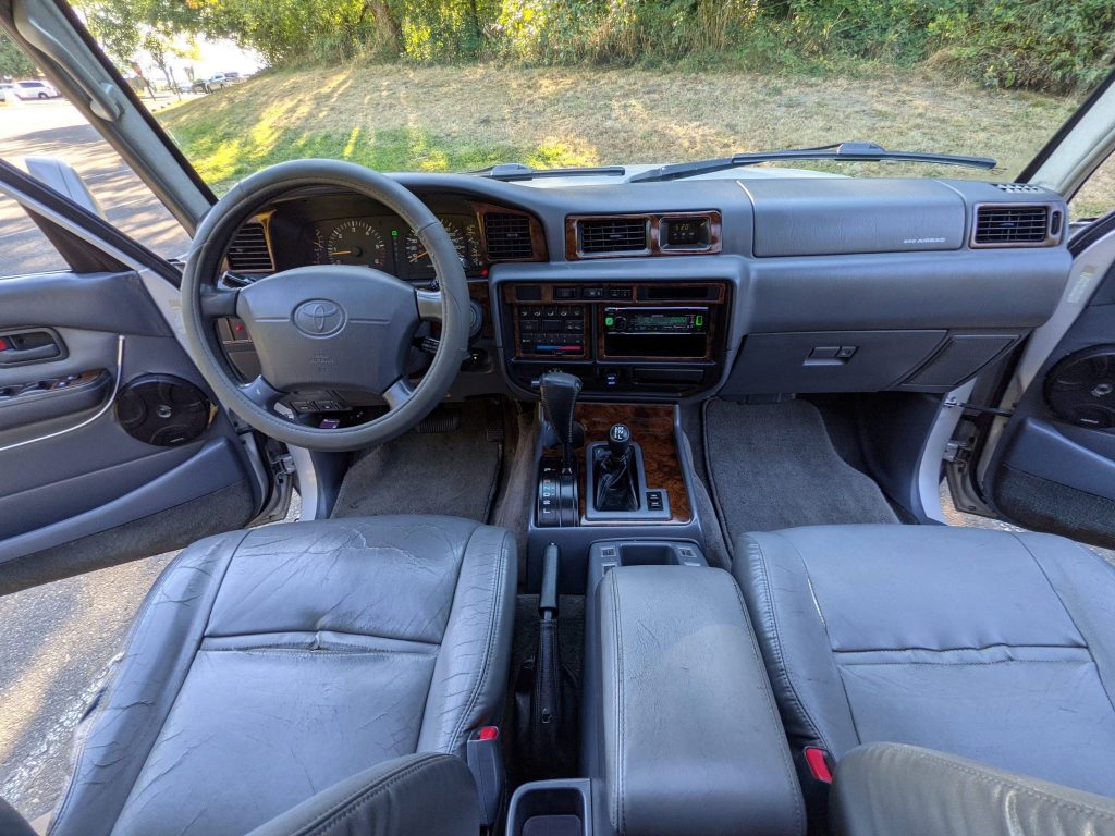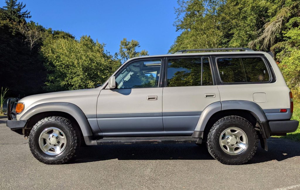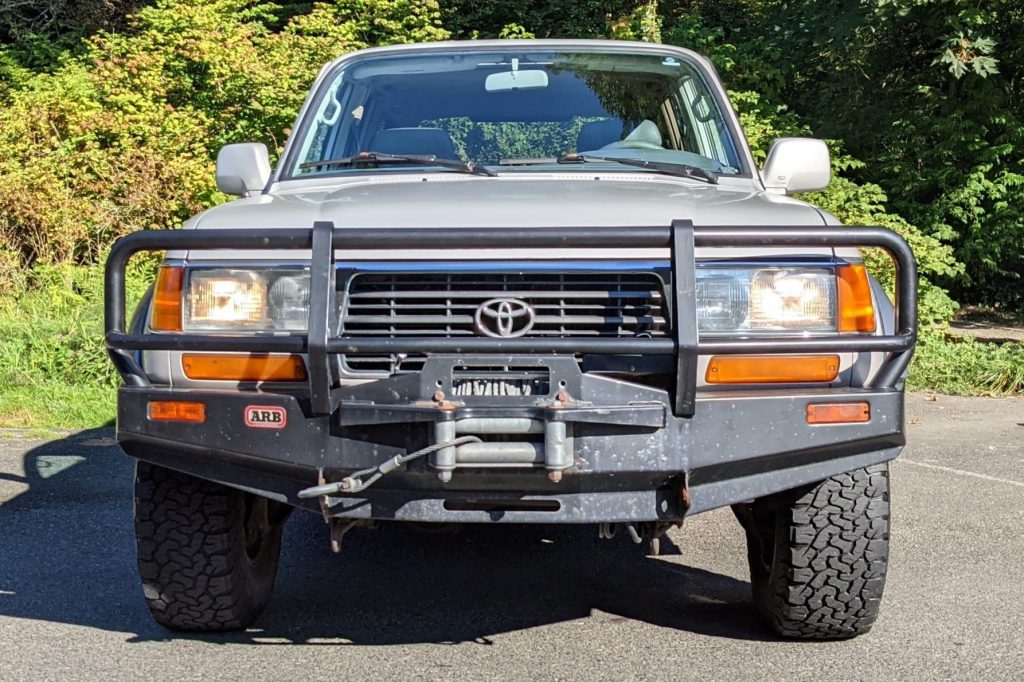 This 1996 Toyota Land Cruiser is finished in beige and gray over gray leather and is powered by a 4.5-liter inline-six mated to a four-speed automatic transmission, a dual-range transfer case, and optional front and rear locking differentials. Additional features include automatic headlights, an ARB front bumper, a Warn winch, 16″ alloy wheels, a sunroof, air conditioning, cruise control, and a Kenwood CD stereo.