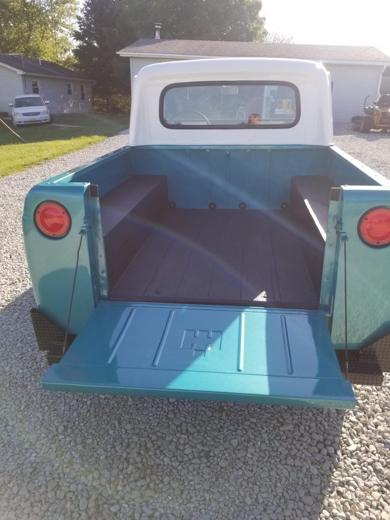 The body was removed from the frame and repainted its current shade of blue following rust repair on a rocker panel by Bryant’s Custom Rods in Marysville, Washington in May 2021. Exterior details include a removable white hardtop, sliding side windows, black-finished bumpers, a textured black bedliner, and a fold-down tailgate.