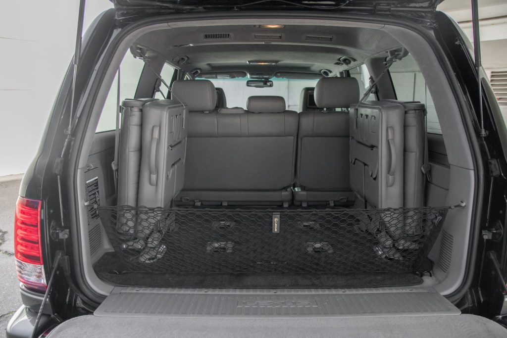 The cargo area is accessed via a split-folding liftgate and tailgate, and it contains two side-stowable third-row seats, a cargo mat, and a removable net.