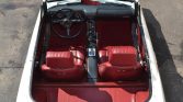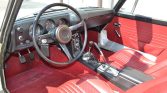 The cabin houses bucket seats that are upholstered in red vinyl and accented by color-coordinating carpeting. Interior appointments include lap belts, a center console, and a rear cargo shelf.
