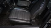 The cabin is trimmed in black leatherette with basket-weave inserts on the front seats, matching door panels and carpeting, and black and yellow Coco Mats covering the footwells and center tunnel. Equipment includes a MOMO steering wheel, a Sony cassette head unit, fold-down rear seats, and roll-up windows.
