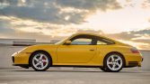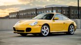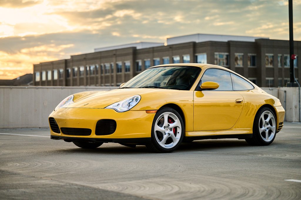 This 2003 Porsche 911 Carrera 4S coupe is powered by a 3.6-liter flat-six that powers all four wheels via a six-speed manual gearbox, and it is finished in Speed Yellow over black full leather with yellow stitching. Equipment includes a speed-activated rear spoiler, 18″ Turbo-look wheels, Park Assist, Porsche Communication Management with navigation, yellow seatbelts, a sunroof, automatic climate control, cruise control, power windows, and central locking. Service in preparation for the sale included an IMS-bearing retrofit and replacing the transmission mounts, cam plugs, and ignition coils.