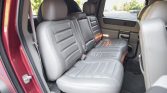 The cabin features seats upholstered in Wheat leather, and the darker gray carpets are protected by Hummer-branded floor mats. Amenities include power-adjustable front seats, heated seats in the first two rows, and a single removable third-row seat, as well as four-zone automatic climate control, push-button 4WD controls, cruise control, and an optional CD stereo with navigation hooked to a Bose audio system.