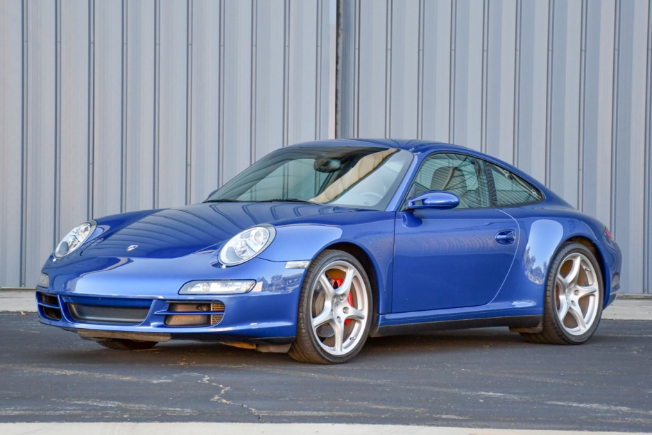 Compared to other 997.1 Carrera models, the 4S features wider rear bodywork. This example is finished in Cobalt Blue Metallic, and equipment includes headlight washers, a power sunroof, automatically dimming side mirrors, a speed-activated rear spoiler, quad exhaust outlets, and a silver Porsche-crest nose emblem.