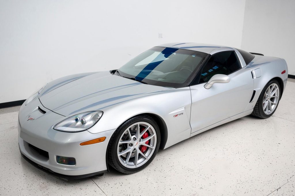 The Z06 features a hydroformed aluminum chassis paired with composite and carbon-fiber bodywork. This example is finished in Blade Silver Metallic and features fog lights, xenon headlights, vented fender panels, and quad exhaust outlets.