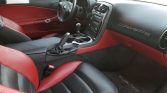 The cabin features bucket seats trimmed in two-tone Ebony and Red leather, matching door panels, and Z06 embroidery on the headrests. Additional appointments include carbon-fiber trim on the center console, dual-zone automatic climate control, cruise control, and an AM/FM/CD stereo.
